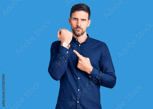 Young handsome man wearing casual shirt in hurry pointing to watch time, impatience, looking at the camera with relaxed expression