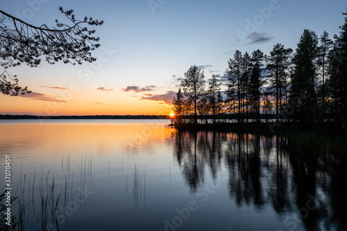 Beautiful summer sunset over finnish lake with silhouette of trees reflecting in water in gold, orange and blue, Finland, Kuusamo, Finland