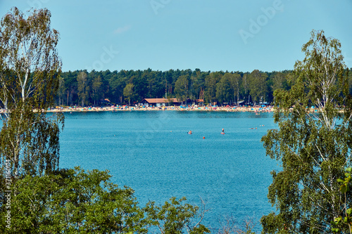 View from the height through two birches to a blue bathing lake with a beach and swimming people