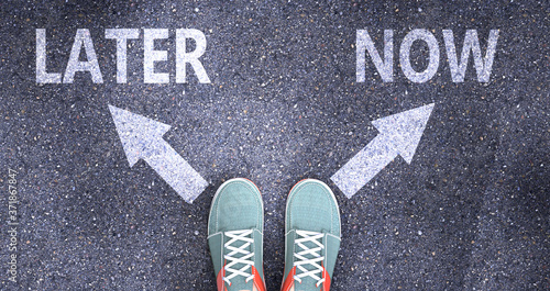 Later and now as different choices in life - pictured as words Later, now on a road to symbolize making decision and picking either Later or now as an option, 3d illustration