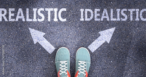 Realistic and idealistic as different choices in life - pictured as words Realistic, idealistic on a road to symbolize making decision and picking either one as an option, 3d illustration