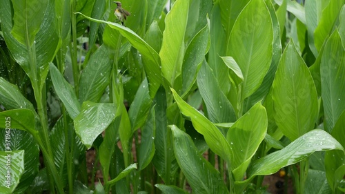 Water drops watering flowers. Drops of water irrigate green tropical foliage with flowers. tropical birds clean feathers in drops of water