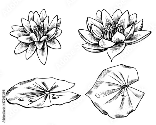 Set with water lilies. Graphics, monochrome flowers and nenuphar leaves isolated on a white background