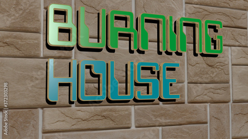 BURNING HOUSE text on textured wall, 3D illustration for background and fire