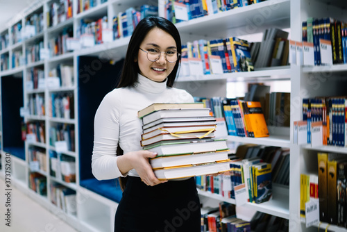 Asian happy woman buying books in bookstore