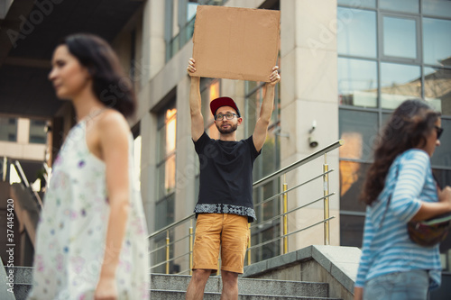 Dude with sign - man stands protesting things that annoy him. Solo demonstration his right to talk free on the street with sign. Copyspace for text. Opinion heard by public. Social life, humor, meme.