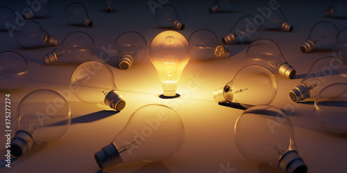 One glowing transparent light bulb standing out from the unlit bulbs.