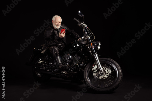 Portrait of his he nice old grey-haired dude hipster rocker traveler sitting on chopper using device searching local tour rout map address gps navigation isolated black color background