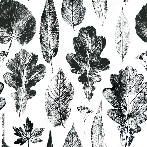 Many black handmade ink leaves stamps scattered on white background. Natural autumn, fall seamless pattern.Printing on fabric, card. Stylish decoration for social media, blog post, interior design.