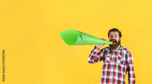 mature crazy mad man pose with megaphone. announcement concept. stop being silent. hipster screaming in the megaphone Activist speaks at rally. Make it heard. oratory and rhetoric