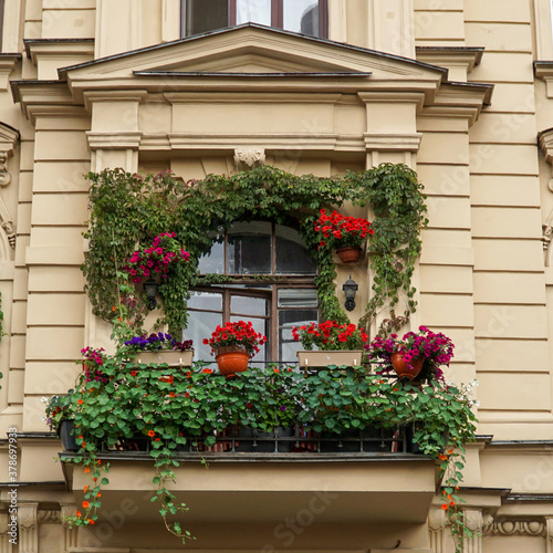 The balcony of the house is richly decorated with flowers and climbing plants.