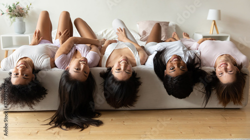 Happy playful multiracial diverse brunette girls besties lying on bed upside down, having fun together on sleepover party, entertaining at sorority fathering, making funny photo, looking at camera.