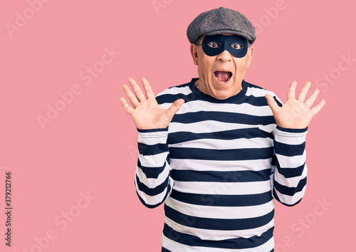 Senior handsome man wearing burglar mask and t-shirt celebrating crazy and amazed for success with arms raised and open eyes screaming excited. winner concept