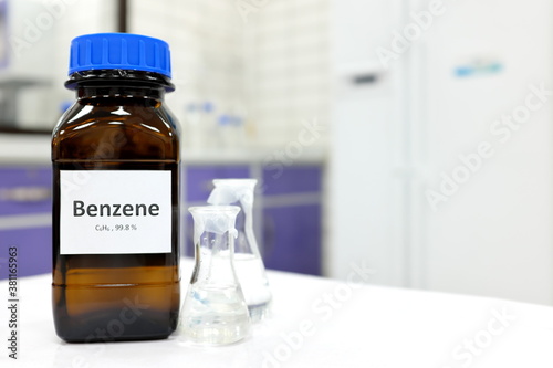Selective focus of benzene liquid chemical compound in dark glass bottle inside a chemistry laboratory with copy space. Aromatic hydrocarbon used in petrochemical industry.