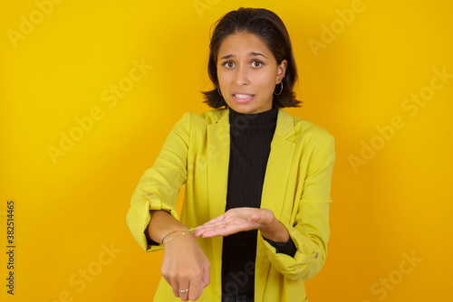 Young hispanic businesswoman wearing casual turtleneck sweater and jacket In hurry pointing to watch time, impatience, upset and angry for deadline delay.