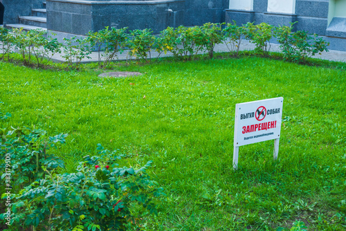 A sign on the lawn with the image of a dog, a translation from the Russian language - please do not walk dogs on the lawn.