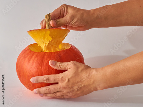 Step by step, we make a Jack Lantern head from a pumpkin. Step 3 - cut off the top of the pumpkin with a knife until soft filling.