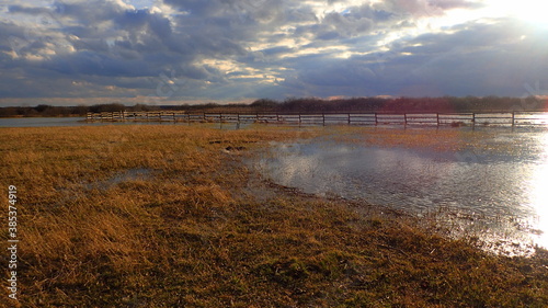 Flooded meadow with golden grasses and dramatic sky during sunset. Tranquil rural landscape reflecting water, perfect for themes of nature, seasons, wetlands, and countryside scenery