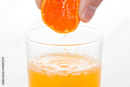 • Refreshing orange beverage being poured into a glass with a slice of orange on the rim