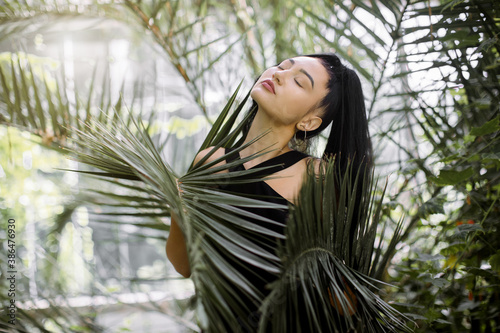Tropic palm tree, summer and natural beauty concept. Pretty young dreamy Asian woman with dark ponytail hair, in black dress, sits under palm trees in the greenhouse, looks up with eyes closed