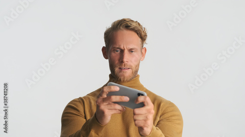 Young attractive bearded man playing in game on smartphone over white background. Modern technology