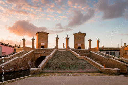 Comacchio, Ferrara / Italy - August 2020: Trepponti Bridge in Comacchio at dawn with a tourist in the center of the columns, sky with clouds