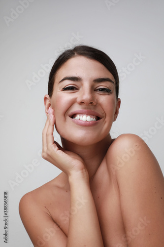 Vertical portrait of young beautiful woman smiling and posing on white background. Beauty concept.