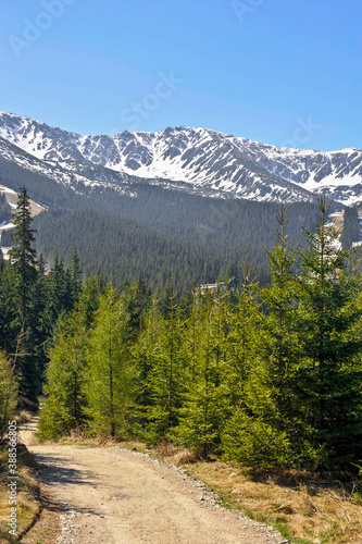 Panorama Tatr nad leśną drogą. Ośnieżone szczyty widziane ze Słowackiego Parku Narodowego
