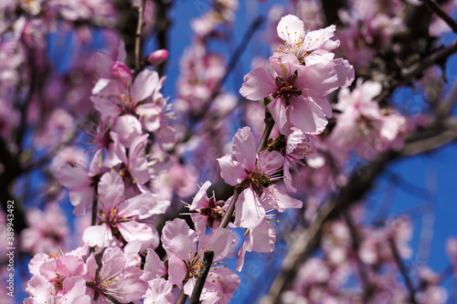 Almond trees, Prunus dulcis blooming, southern wine street, Gimmeldingen Germany