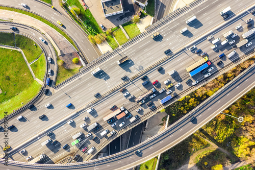 Aerial drone view of road interchange or highway intersection with busy urban traffic in modern city during sunny day. Traffic jam aerial view.