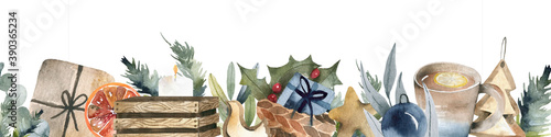 Horizontal banner with christmas tree garland and ornaments. Hanging gold and red balls and ribbons. Great for flyers, posters, headers. illustration