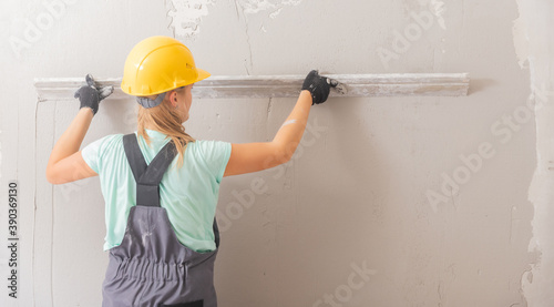 Construction worker usually levels concrete walls with plaster, preparing for painting