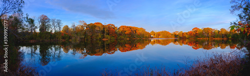 Panoramic Autumn Woods with Colorful Foliage and Reflections on the Glacial Kettle Pond on Cape Cod in November
