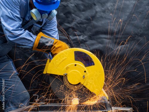 New House Building home Project.Technicians engineering foreman skill wearing blue protective clothing are cutting off industrial factory steel electric wheels pipe for customers.