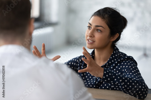 Customer expectations. Inspired young indian female describing plan idea to business partner, expressing wishes on interior project to designer, presenting vision of future house to real estate agent