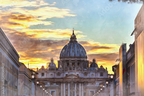 Beautiful view on Papal Basilica of St. Peter in the Vatican colorful painting