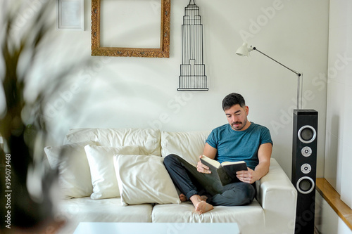 Hombre leyendo un libro en casa. Concepto confinamiento.