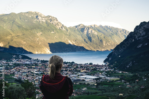 Young woman is enjoying the view odf Riva del Garda valley surrounded by mountains, Italy.