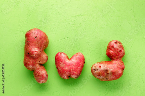 Ugly potato on a green plaster background. Vegetable or food waste concept. Top view, close-up.