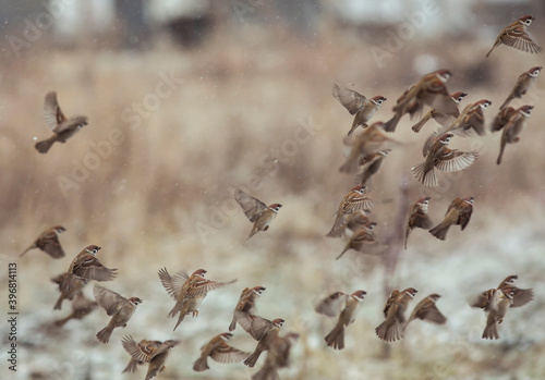 flock of small birds sparrows fly up into the sky in the garden in winter