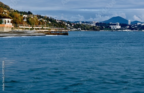 Seascape with a jutting cape with a rotunda in the rays of sunset against the background of mountains and the city