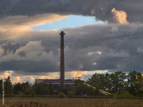 Komin fabryczny i otwarte czyste niebo nad nim, wokół same chmury i smog.