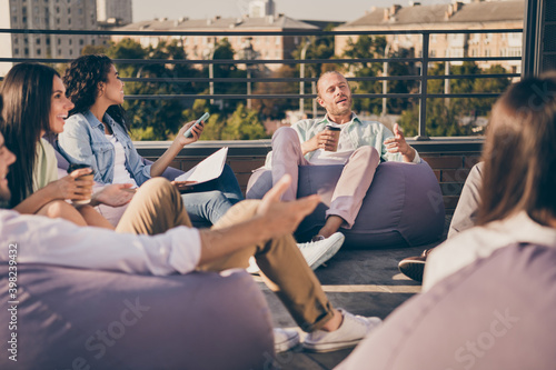 Nice stylish cheery partners sitting in bag chairs discussing corporate strategy plan unity progress on roof outside outdoor sunny day