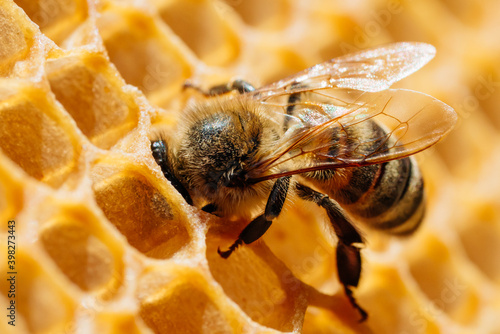 Macro photo of working bees on honeycombs. Beekeeping and honey production image