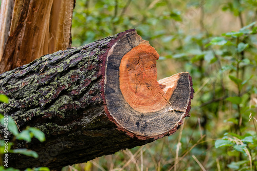 Ucięty pień drzewa z czerwonym środkiem w lesie, prace leśne