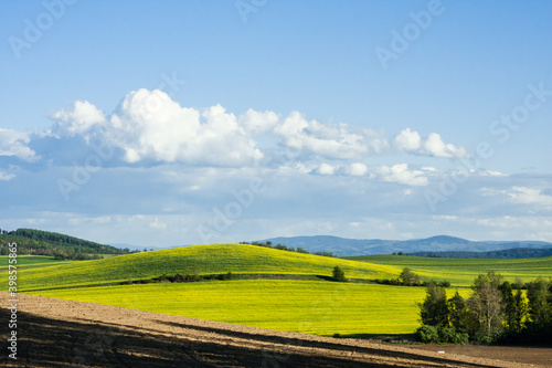 Krajobraz, pagórki, pola kwitnącego rzepaku, błękitne niebo z białym obłokiem. W tle góry porośnięte lasem.