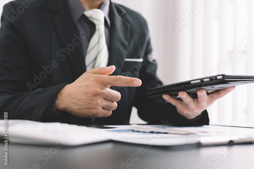 Glamorous business people use tablets to communicate online and remote business matters within modern offices.