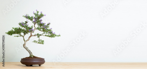bonsai tree in pot on wood table copy space texture backgrond advertising