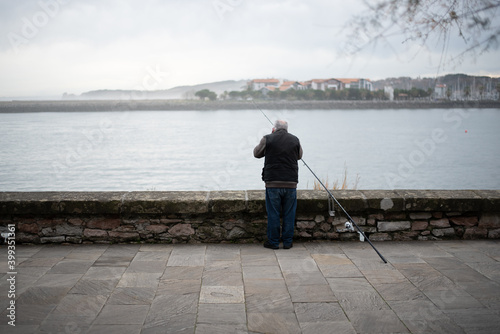 señor mayor de espaldas pescando en la costa de un rio en Hondarribia, Pais Vasco.