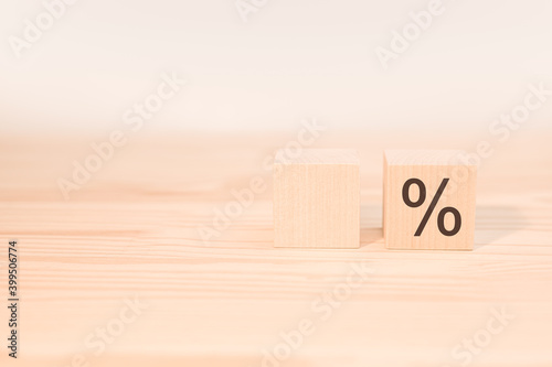 wooden dice cubes with percent symbol. two wooden blocks. one with space for your text, one cube with the percent sign. Business concept, copy space.